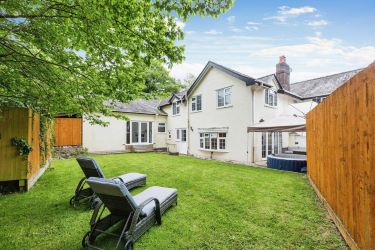 To the front is a driveway leading to the large double garage. To the rear there is a patio area complete with hot tub and a lawn, gravel area and raised flower bed.