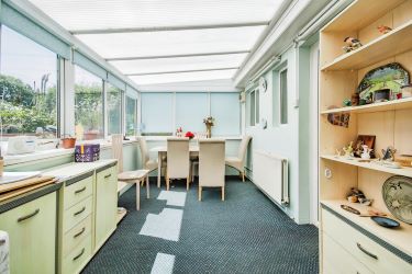 CONSERVATORY 16'1" x 8'2" approx. UPVC construction on a block built plinth. Poly carbonate roof. Door to outside.