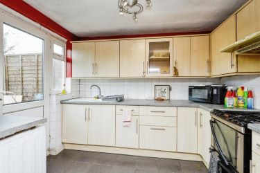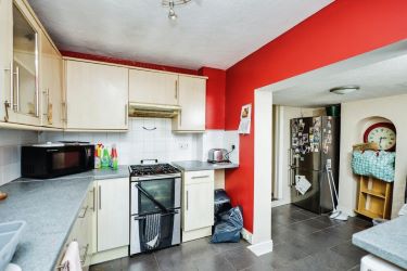 Kitchen - 9'8 x 7'6 (2.95m x 2.29m) - Single drainer sink unit with cupboards under, matching wall and base units, work surfaces, partly tiled walls, electric cooker point, plumbing for washing machine, double glazed window and door opening to rear.
