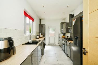 A modern range of low and eye level units incorporating a sink and drainer unit, space for range cooker with extractor fan over, space for fridge freezer, washing machine, tumble dryer, partly tiled walls, tiled flooring, spot lights to ceiling, double glazed window and door to rear garden area.