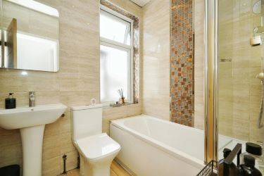 A three piece suite comprising of bath with shower over, low level WC, pedestal wash hand basin, wooden flooring, fully tiled walls, spot lights to ceiling, double glazed window and wall mounted stainless steel heated towel rail.