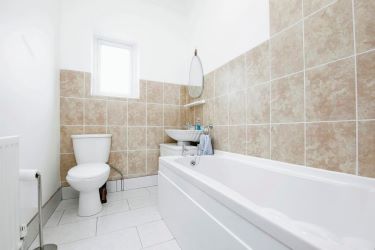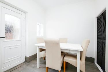 Step inside to a spacious, light-filled living room, featuring newly laid laminate flooring and a neutral colour palette that enhances the sense of space. The large bay window allows natural light to flood the room, creating a warm and inviting atmosphere. A feature fireplace adds a touch of character and serves as a focal point for the space.
