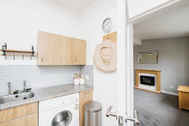 Entrance hallway off which is the bathroom with over bath electric shower and tiled splash back, good sized living room with large window allowing plenty of natural light, divided up by a partition where the double bedroom is with built in mirrored wardrobe. A small but bright, adequate kitchen is off the living area with ample storage and worktop space.