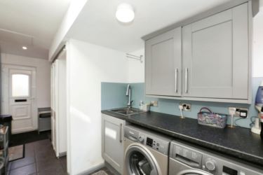 Adjacent is the well-appointed kitchen, which offers a modern layout with ample storage and worktop space, perfect for preparing meals while staying connected to the living areas. Off the kitchen, you’ll find a practical utility room, ideal for keeping household chores out of sight and maintaining the tidy, streamlined aesthetic of the home. A convenient downstairs WC completes the ground floor, offering added functionality for busy family life.