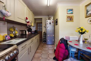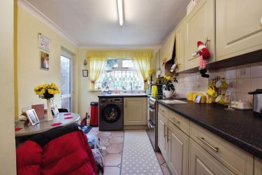 - [ ] Kitchen Extension: An extended kitchen space with modern Shaker style units. It includes an under-stairs cupboard for additional storage. The kitchen is equipped with plumbing for a washing machine and provides space for an oven and fridge freezer.