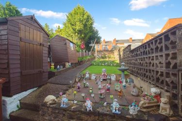 Outside - The enclosed ear garden is designed with tiered sections, majority laid to lawn with two sheds