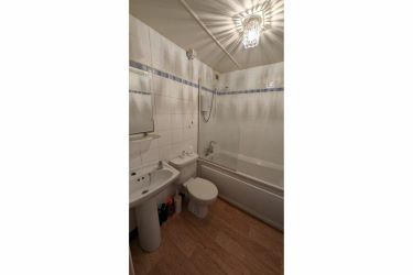 BATHROOM attractively refitted with a white suite comprising panelled bath with shower screen and electric shower, pedestal wash hand basin, wc low type flush, attractively tiled walls and vinyl flooring
