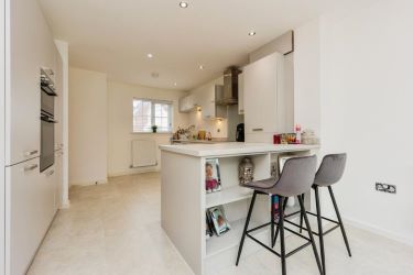 The ground floor features a spacious and modern open-plan kitchen, living and dining area. The contemporary kitchen includes integrated appliances and flows seamlessly into the dining and living space, creating the perfect setting for entertaining or family life. Patio doors at the rear open out onto a generous garden, ideal for outdoor relaxation, while a guest W/C adds to the convenience.