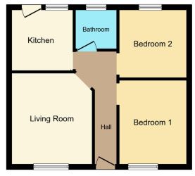 The interior features an entrance hall, sitting room, kitchen, two bedrooms, and a bathroom.