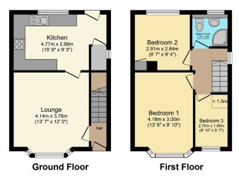 First Floor: Upstairs, you'll find three well-sized bedrooms. The main bedroom is a generous 4.18m x 3.00m (13' 9" x 9' 10"), while the second bedroom, 2.91m x 2.84m (9' 7" x 9' 4"), and third bedroom, 2.70m x 1.69m (8' 10" x 5' 7"), provide flexible options for family, guests, or a home office. The modern shower room is compact yet functional.