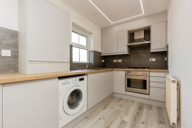 A range of low and eye level units incorporating a stainless steel sink and drainer unit, built in hob with stainless steel extractor fan over, built in fridge freezer, space for washing machine, double glazed window, partly tiled walls and doors to separate storage cupboard.