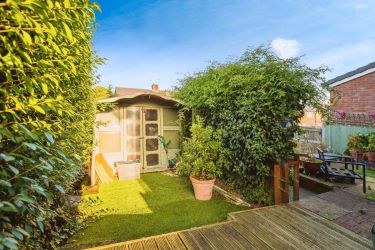 Outside, the property boasts a driveway for off-road parking, a front garden with mature shrubs and bushes, and a timber gate providing access to the rear garden.