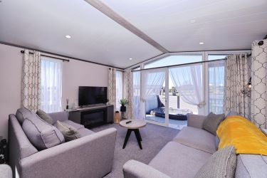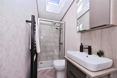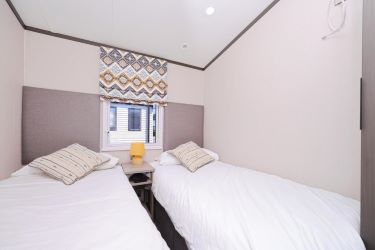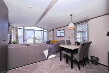 The lodge opens into a welcoming entrance hallway with practical storage and a light, airy feel throughout. The heart of the home is the open-plan kitchen/living/dining area, with large windows and French doors that frame the serene lake views, and offer access to the decking area complete with sunken hot tub. The space is thoughtfully laid out to accommodate both a cosy lounge area and a dining space for entertaining.