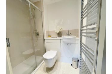 The en-suite consists of a shower, tall heated towel rail and a fitted cupboard.