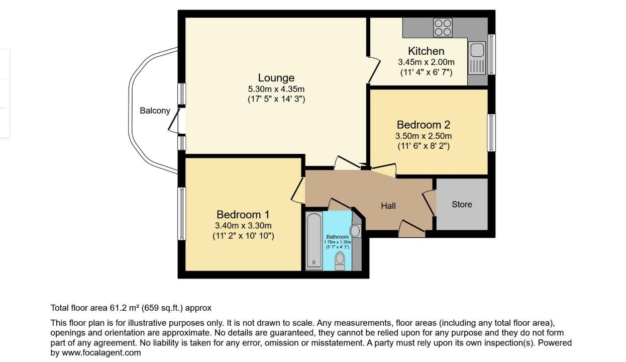The flat comprises a generous lounge with access to the balcony, a separate fitted kitchen, and two good-sized double bedrooms. A modern bathroom, practical storage cupboard, and welcoming hallway complete the layout.