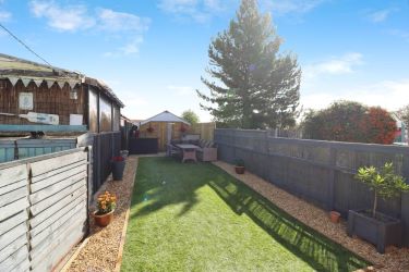 Outside, the garden has been designed for ease of maintenance, featuring an artificial lawn and a smart stoned border. A shed provides additional storage options, while the outdoor space enjoys a good degree of privacy.