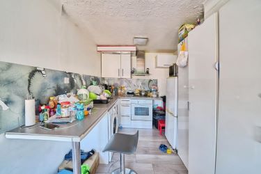 The fitted kitchen is set off to one side, equipped with contemporary units, an electric hob, oven, and space for under-counter appliances, making it a highly practical and compact cooking space.