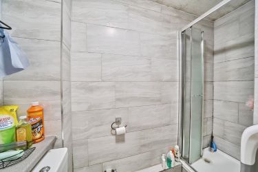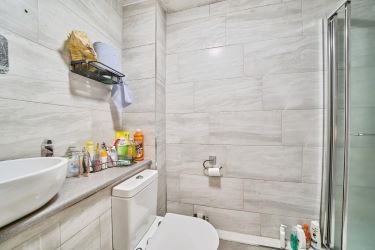 The shower room is finished to a modern standard with a walk-in shower enclosure, wash basin with vanity, and WC.