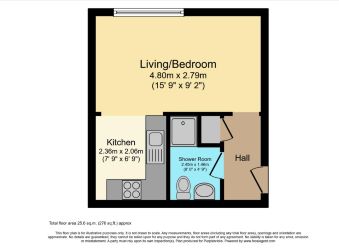 The apartment opens into a small entrance hallway, providing access to the main living space and shower room.