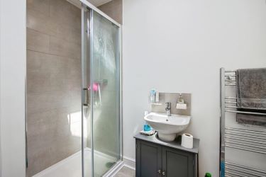 The high-spec shower room comprises a shower cubicle, hand basin, WC, and a heated towel rail, finished to a contemporary standard.