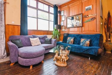 The property welcomes you into a spacious lounge that retains its period charm, featuring a feature fireplace, exposed wooden floors, and wooden panelling. The room is ideal for cosy evenings, entertaining and it is cool in the summer.