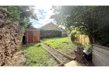 The property features an enclosed rear garden that has been predominately lawned, with initial paved area and pathway leading to the rear. Surrounded by hedging and fencing and providing space for a shed.