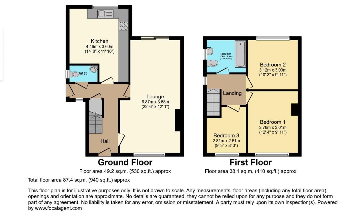 On the right are two double bedrooms, each with a view of Front and Rear respectively and a single bedroom with a front view.