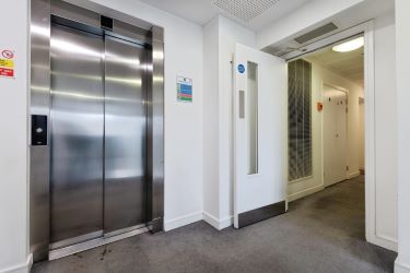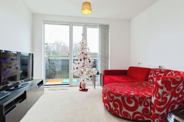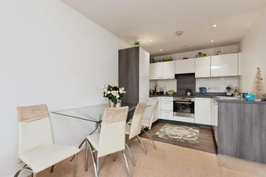 A modern one-bedroom flat featuring contemporary fittings throughout, lift access, and a private balcony. The entrance opens to a hallway with a modern bathroom on the left, complete with an overhead shower and heated towel rail. Directly ahead is a spacious double bedroom. To the right, an open-plan kitchen, dining area, and lounge lead to French doors opening onto a private balcony overlooking the front of the building.