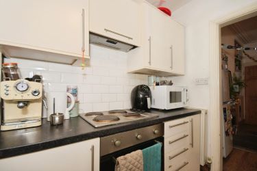 Side Entrance: Step into a sleek fitted kitchen, complete with integrated oven and hob, and a recess for under-counter appliances.