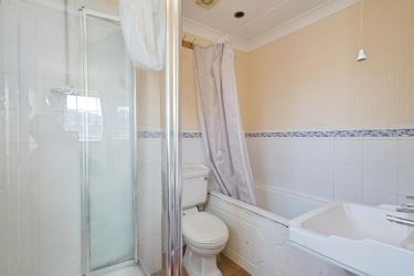 A family bathroom, with bath, shower, basin and WC, which would benefit from updating.