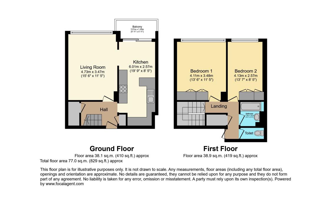 The lower level features a welcoming entrance hall leading to a bright living room, complemented by large windows that draw in natural light. The adjoining kitchen/diner is well appointed and provides ample storage and workspace along with sliding doors to the private balcony. Upstairs, the property offers two well-proportioned bedrooms, both with built in wardrobes and enjoying elevated outlooks, along with a family bathroom and separate WC for added convenience.