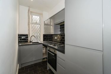 To the left, there is a sleek, compact fitted kitchen, complete with integrated oven and hob. Also to the left is a neatly recessed staircase leading to the first floor.