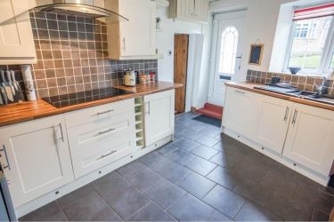 The well-presented accommodation comprises a lounge featuring a character fireplace and wood-burning stove, a kitchen that opens into a dining area, a useful walk-in pantry, utility room, and a generous ground floor bathroom with a four-piece suite. Upstairs, you’ll find two comfortable double bedrooms and a third single bedroom.