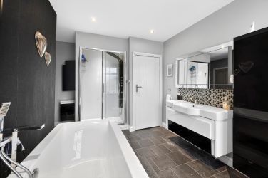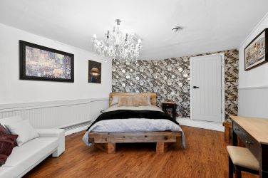 The first floor continues to impress with five bedrooms, two of which benefit from en-suite facilities. There is an additional kitchen, a lounge, studio room, shower room, and a family bathroom, along with a further shower room. This arrangement offers excellent potential for self-contained living areas, guest accommodation, or creative/work-from-home use. A patio area on this level provides valuable outdoor space and an elevated place to relax.