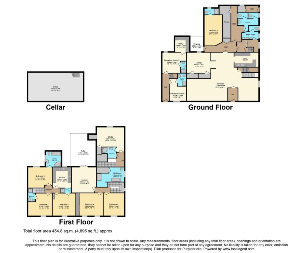 Further ground floor accommodation includes a ground-floor bedroom, two shower rooms, male and female toilet facilities, and additional hallway areas, enhancing the property’s suitability for high-occupancy or mixed-use living. A veranda provides a pleasant transition between indoor and outdoor space.