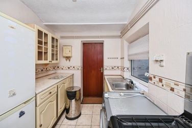 The fitted kitchen is positioned to the rear of the property and provides a practical workspace with access to further storage and utility potential. Beyond the kitchen, an inner hall leads directly to the rear courtyard and gives access to the ground-floor bathroom. The bathroom, currently set out with a traditional suite, would benefit from modernisation but offers a good footprint for improvement.