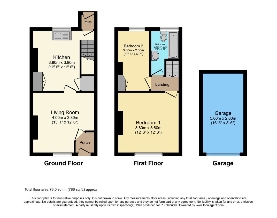The ground floor comprises a spacious living room and a generous kitchen, both benefiting from good natural light, along with useful porch entrances. To the first floor are two well-sized bedrooms and a modern family bathroom.