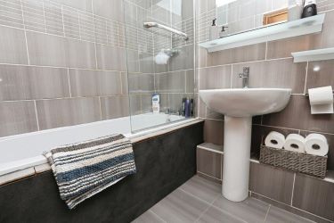 There are two bedrooms, with the master benefitting from fitted wardrobes that provide useful storage while keeping the room feeling uncluttered. The second bedroom offers flexibility — ideal as a guest room, home office, or dressing space. A well-appointed bathroom completes the accommodation, offering a sleek and practical space.