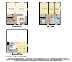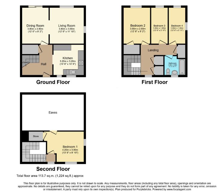 The ground floor includes a bright living room, separate dining room and a practical kitchen to the rear. Upstairs, the first floor provides three bedrooms and a family bathroom, while the second floor features a generous main bedroom with useful eaves storage, creating a private top-floor retreat.