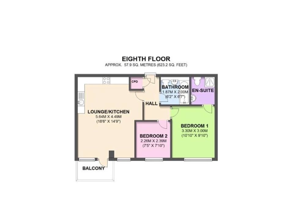 The modern fitted kitchen flows seamlessly into the living space, while two generously sized bedrooms provide comfort and practicality, including a master with ensuite. An additional well-appointed bathroom completes the accommodation.
