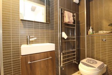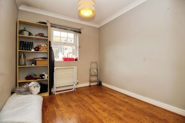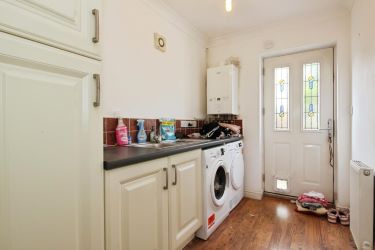 The ground floor comprises a welcoming entrance hall with access to a useful utility room, bedroom three, a shower room, coat cupboard, storage cupboard, and integral garage. The utility room offers space and plumbing for a washing machine and tumble dryer, along with direct access to the rear garden. Bedroom three is a good-sized double featuring laminate flooring and neutral décor. The ground floor shower room is fitted with a modern three-piece suite including a shower cubicle, wash hand basin, WC, and a heated towel rail.