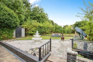 Externally, there is a good-sized rear garden with a patio area, pebbled section, flower beds, garden shed, built-in fish pond and a built-in brick BBQ. To the front, a gated driveway leads to the garage and a neatly maintained lawn.