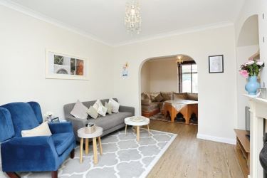 The stairs are ahead on the near right and the door on the left leads you into Open Plan Dining Room and Lounge with Feature Fireplace and French Doors access to the rear garden with large patio and lawn.