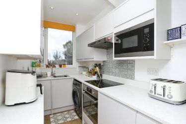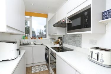 Back in the Hallway straight ahead you will see the modern fitted kitchen with integrated dishwasher, small fridge, oven and hob and a recess for a washing machine.
