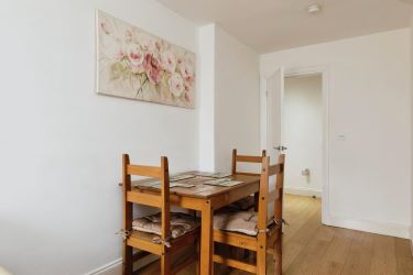The entrance hall provides access to all principal rooms. To the right is a sleek, fitted kitchen featuring an integrated oven and hob, along with recesses for a tall fridge/freezer and washing machine. Opposite, the bright lounge incorporates a comfortable dining area, ideal for both relaxing and entertaining.