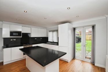 The property opens into an entrance hallway leading to the heart of the home — a bright and airy open-plan kitchen/lounge/diner. This impressive space is fitted with modern units, ample work surfaces, integrated appliances and a central island with dining, complemented by generous living area that flow seamlessly together. French doors open out to the rear garden, allowing natural light to flood the room and creating a perfect indoor–outdoor connection during the warmer months.