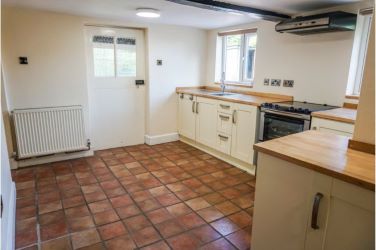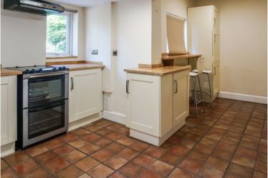 Three rear aspect double glazed windows, range of base units with square wooden worktops, stainless steel sink and drainer with mixer tap over, cooker point, space for fridge freezer, radiator, tiled flooring, space for dining table and chairs, timber door through to Utility room with a further timber door leading through to dining room.