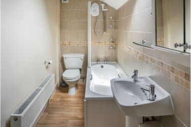 Velux window, panel enclosed bath with wall mounted shower and folding glass screen, low level WC, pedestal wash hand basin, part tiled walls, radiator, extractor fan, open plan walkway through to timber door leading to bedroom two and bedroom three.