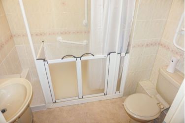 Three piece suite comprising walk-in shower cubicle with stainless steel shower over, low level w/c and wash hand basin with vanity unit. Tiled walls. Electric wall heater.