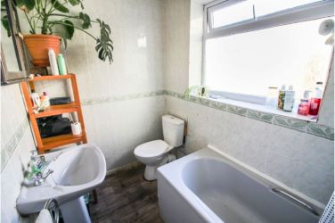 Three piece bathroom suite comprising of a panel bath with shower over, low flush WC, pedestal hand wash basin and tile splash backs.